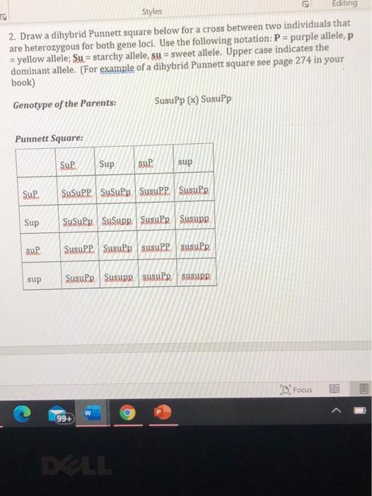 Punnett Squares Dihybrid Crosses from s3.studylib.net The top and the female's gametes down the side. A dihybrid cross tracks two traits. A phenotypic ratio of 9:3:3:1 is predicted for the offspring of a ssyy x ssyy dihybrid cross. Remember that an individuals genotype for a dihybrid cross has 4 alleles. The punnett square is a diagram that is used to predict an outcome of a particular cross or breeding experiment. Use the gametes from #3 and #4 to set up a punnett square below. Record the probabilities for genotypes and phenotypes of the offspring (f2 generation) as percents and ratios. Write the phenotype ratio 50% purple.